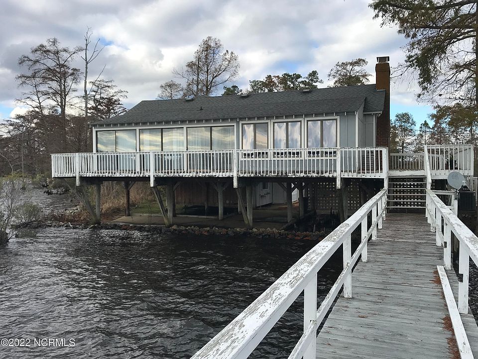 This home provides beautiful, elevated river views of Elizabeth City's waterfront.  Dining, kitchen, sunrooms and living room all have river views.  Attractive wide pine plank flooring, many feet of decks, private pier and  tiki house over the water.  Attached two car garage with stair chair to the living level.  Very attractive waterfront home.