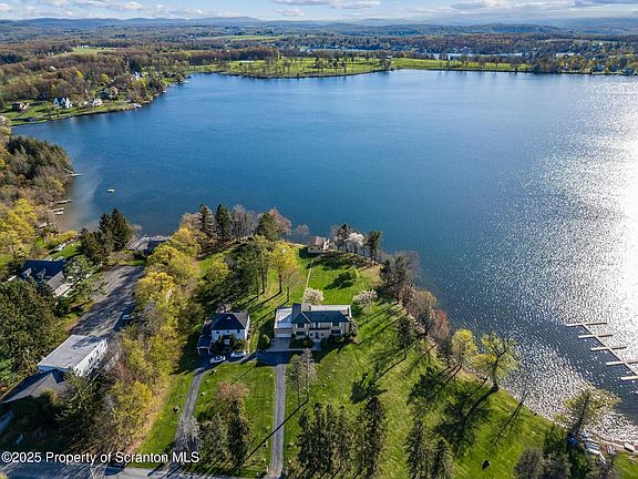 PUBLIC AUCTION - Sunday NOV 2nd - 1 pm. Open house tours start at 11 am day of auction. Call listing agent to register.John Regan Auctions for more information.Available for the first time in over 55 years, this lakefront estate offers an extraordinary combination of privacy and natural beauty. 3.4 deeded acres with over 550 feet of shoreline on the pristine, spring-fed waters of Crystal Lake, the east side of the lake enjoys panoramic sunset views and Elkview Country Club across the water.The main residence offers 4,018 sq ft of living space, including 3 bedrooms and 3.5 bathrooms. Built in 1952, the home blends Neoclassical Revival architecture with Mediterranean flair, featuring a white brick exterior, concrete tile roof, and a grand ironwork front door. A sweeping circular staircase with brass railing serves as a central design element, surrounded by hardwood floors, high ceilings, and a circular family room with expansive lake views. The living room is anchored by a white Italian marble fireplace, with matching marble window sills throughout.An inviting bar and entertaining room pays homage to the owners' love of the outdoors with pine paneling and local wildlife decor. The screened porch opens to a bluestone sidewalk that leads to the boathouse.The estate is approached via a stately 150-foot driveway flanked by two masonry pillars. Elevated slightly above both the road and the lake, the home enjoys enhanced privacy and sweeping views.A separate 672 sq ft boathouse, built in 1989, includes a full kitchen, bath, open-concept living and dining area, and a 275 sq ft deck overlooking the lake.Crystal Lake is a private, glacial, spring-fed lake covering approximately 180-190 acres with depths reaching up to 86 feet. The lake permits both motorboats and personal watercraft. The property is just 2.5 hours from New York City and Philadelphia, and only 9 miles from Elk Mountain Ski Resort, making it a rare year-round retreat.