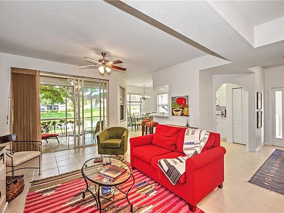 Bright 1st floor end-unit in coach home with attached one car garage and Southwest facing views of lake in the lovely enclave of Dover Place in Briarwood. Flowing floor plan with 9 foot tray ceilings in living room open to dining and kitchen making for one central gathering location. The 3 bedrooms have LVP flooring while the gathering room sports all tile flooring. The master bath offers a deep soaking tub and separate shower with a generous sized double vanity. The third bedroom has a separate exterior entrance with French doors and private entrance into an adjoining fully updated new 2025 bathroom. Laundry in residence offers plenty of shelf storage and is already plumbed for utility sink. Watch breathtaking sunsets from the lanai and dining room, both protectively shaded by stunning live Oaks. The lanai features electric hurricane shutters while the windows have lockable accordion shutters all installed in 2018. All screens were replaced in July of 2023, new roof 2024. The garage has a Lift Master garage door opener, desirable epoxy floors installed in 2020, and a super convenient extra 10' x 4' storage space. The entire home has FPL surge protection.
