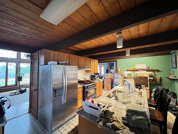 Maine country home for sale in Lincoln, Maine. This home features a mudroom, laundry room, kitchen, living room, sunroom, full bathroom, a master bedroom w/ full bathroom, 2 additional bedrooms, and a loft. There are three detached garages with power, a greenhouse, garden shed and chicken coup. The property has a large fenced in back yard and several acres of field that surround a man-made pond. Home has a private well & septic, a paved driveway and sites on 28.6+/- acres of land with pasture/fields and wooded acres. Close to shopping, hospital and several lakes.