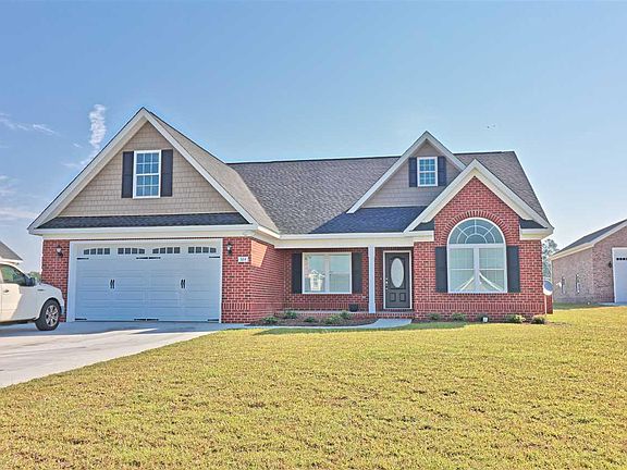 This 4 bedroom/3bath all brick home, located on a large home site in the desirable Brickyard community in Aynor, features huge his and hers walk-in closets, formal dining room, spacious island-style kitchen, and 42" glazed cabinets. This top-selling Dogwood plan consist of an open floor plan with 10' flat ceilings, popular island style kitchen, upgraded 5 piece door glazed cabinetry, laminate wood flooring, multiple storage closets, Whirlpool stainless appliances, and more! The large master bedroom and bath features a garden tub, oversized shower, double vanity, and two huge his & her walk-in closets. Exterior features include carriage style garage doors with glass, shake gables, quoined brick corners and soldier course, extended concrete double drive, entry sidewalk, and more! Call to view this lovely home! The Brickyard, located just outside of Aynor SC, is now offering large home sites and custom built homes for a comparable price as a small lot and home in a cookie-cutter subdivision. In The Brickyard, all home sites are half acre and larger, and offer enough room for a detached garage, swimming pool, kids play area or garden. Landscaped brick columns adorn both entrances to the community, and wide, curb and gutter streets meander through mature Southern Pine, Maple, and Oak Trees. Ornamental street lamps light the way for a pleasant afternoon bike ride or jog. A golf cart ride up the street, leads to Aynor’s community pool, parks, schools, churches, and local merchants and restaurants. Visit us on the web for model home hours. If you’re desirous of a relaxed small-town lifestyle, take a look at Aynor, the “Gateway to the Grand Strand”. The Brickyard truly is a break from the norm :)