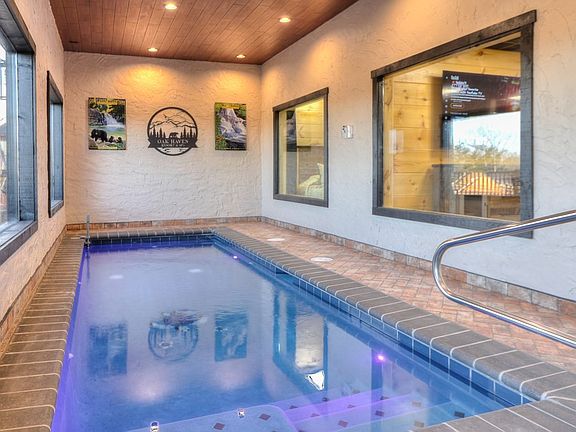 Cabin 112 is a brand new 4 bedroom cabin with a gameroom, firepit, indoor pool, with a view. As you step onto the large open front porch, you'll see it was designed to gather everyone together whether you're outdoors or indoors. Its luxury meets function at its finest. Entering the front door, you'll see the open floor plan with beautiful cedar finishing woodwork and the modern amenities you love. This massive pool lodge sleeps up to 12 guests and boasts two master suites with King Beds off the main level and 2 suites with 2 Queen beds each off the lower level. The lower level is where the real fun begins, starting with your very own private indoor pool with a security keypad for safety. You'll love the fun-filled game room, sun deck with view, and hot tub situated off the lower level. A work of art only appreciated in person.