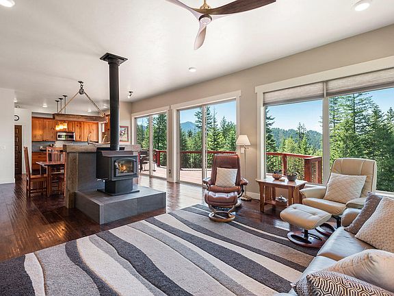 Nearly home with 4 bedrooms and 3 full baths. Sitting above the Idaho Club golf resort, but not part of their HOA.. So close to the lake and abundant recreation opportunities. The kitchen has upper-end appliances, soap stone counters and beautifully appointed solid wood cabinets. Large panoramic south facing windows flood the home with light year round. The home was built at just the right elevation and exposure that the high summer sun sits just above the roof line, while the lower winter sun gives the home solar gain. Open kitchen, living and dining room with a woodstove for atmosphere and heat if so desired. The Master bedroom suite is on one side of the home, with the additional bedrooms and shared bath on the other. Upstairs is another bedroom or family room with an