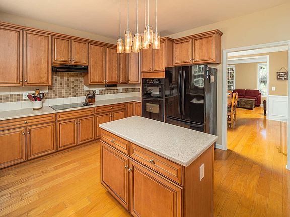 - RoomKitchenFeatures: Kitchen Island, Pantry, Eat-in Kitchen, Floors-Hardwood, Cabinets-Stained, Backsplash-Tiled, Counter Tops-Solid Surfac