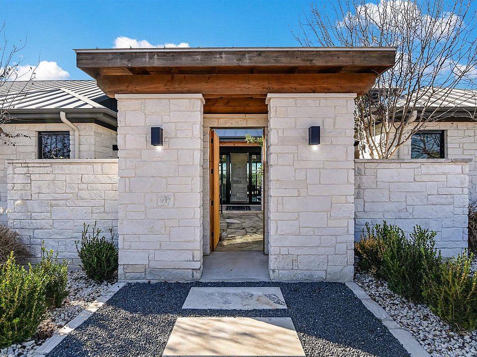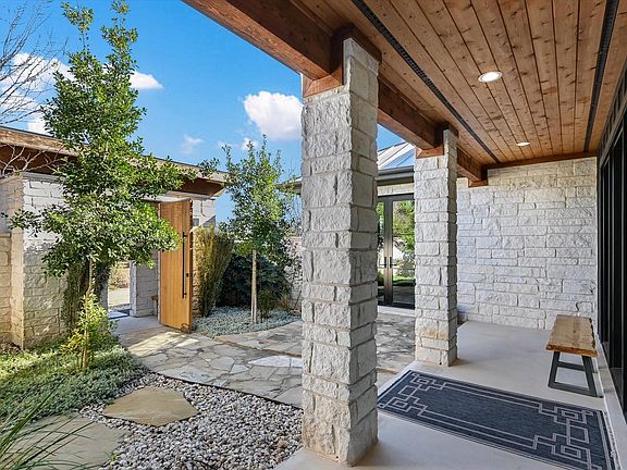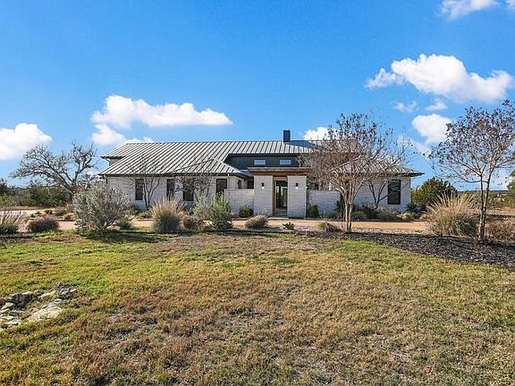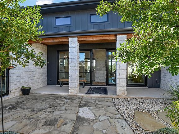 Set on two serene acres in the heart of the Texas Hill Country, this exceptional Creek Road Ranch estate offers refined luxury just minutes from Dripping Springs and within walking distance of Camp Lucy. A wet-weather creek meanders along the back of the property, creating a tranquil natural backdrop that enhances both privacy and views. The thoughtfully designed 3,611+- sq ft residence blends modern craftsmanship with timeless Hill Country style and includes space to expand with a future 625+- sq ft second-floor addition, allowing room to grow without compromise. Inside, polished and sealed concrete floors, custom cabinetry, and a sophisticated mix of soapstone and quartz countertops set a tone of understated elegance. The airtight construction minimizes dust and enhances energy efficiency, while multiple gas fireplaces create warm, inviting gathering spaces. High-end appliances convey, and a built-in surround sound system serves the kitchen, living area, and outdoor patio for seamless entertaining. Remote-controlled shades in the bedrooms and on the back patio add both convenience and comfort. Outdoor living is equally impressive, featuring private front courtyards and a secluded courtyard off the primary bath, a three-car garage, and a custom-built pool with a heated spa designed for year-round enjoyment, completely serviced by City Water which is a rarity in the Hill Country. Security cameras monitor the exterior and can be accessed remotely, offering peace of mind without sacrificing style. Gorgeous Hill Country views available 24/7 with a sunset that will take your breath away. Located within the exclusive Creek Road Ranch Subdivision, this property delivers a rare combination of luxury, privacy, and proximity—an elevated Hill Country retreat suited for the most discerning buyer.