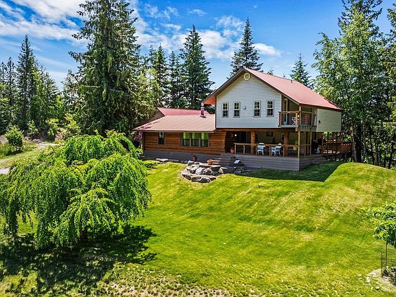 Welcome to this hidden gem where the gentle sound of the creek harmonizes with breathtaking mountain views. It provides an unparalleled escape into nature, in 4 minutes you are at the Lake and in 29 minutes you are at Schweitzer Mountain Ski resort. This delightful home, set on an expansive 10.14 acres, boasts an array of remarkable features. As you step inside, a large, covered deck invites you to host unforgettable gatherings. The main level showcases a stunning living area with vaulted ceilings and a warm fireplace, creating the perfect ambiance. A chef's kitchen awaits, offering abundant counter space and cabinets, while the delightful dining area, encased in windows within the turret, brings the beauty of the outdoors inside. You'll also find a spacious bedroom complete with a private deck, along with a beautifully appointed full custom bath. Venture upstairs to discover the breathtaking primary bedroom, featuring an impressive walk-in closet and a private deck. The custom-designed full bath is a true masterpiece, featuring soapstone, glass, and a luxurious clawfoot tub. The turret also houses a versatile room that can serve as an office or additional bedroom, plus another roomy bedroom awaits. The walkout basement offers a self-contained guest suite, complete with kitchen and bath. A large detached two-car garage includes a guest apartment above, perfect for visitors or rental. This remarkable property also features two impressive shops, a generously sized fenced garden, a stage or camping platform in the field, a serene creek, lush pasture land, and forested areas with majestic trees—all ensuring maximum privacy in this enchanting oasis. Don't miss out on this extraordinary opportunity!