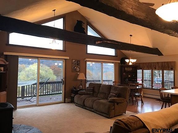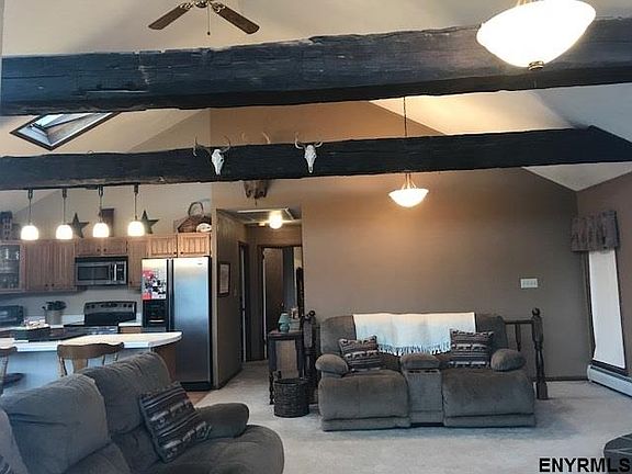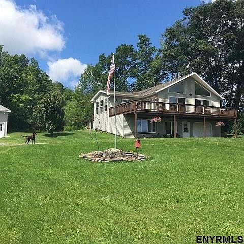 You just have to see this adorable,not your average, raised ranch.This home has vaulted ceilings,exposed beams,a wall of windows,and is move in ready.3 bedrooms,2 full baths and a huge laundry room. Open floor plan for gatherings and a huge family room downstairs. The deck is just perfect for relaxing and watching the sunset or having friends and family over for a bbq. Lots of privacy on 5 acres. There is a 30x50 4 bay garage with automatic garage doors,12ft ceilings,water and heat.