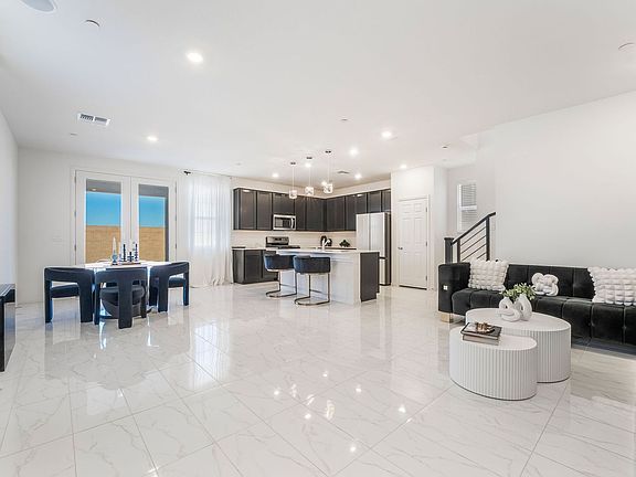 This furnished home showcases a modern and tasteful design throughout, featuring an inviting open floor plan and a stylish kitchen with an island, stainless steel appliances, and a pantry for added storage. Upstairs, a versatile loft provides additional living space. The primary suite offers a private bath with dual sinks and a walk-in closet, while the additional bedrooms are generously sized. The backyard is designed for modern living, complete with turf and pavers for a sleek and low maintenance outdoor space.