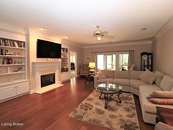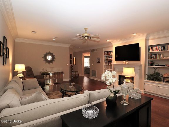 Beautiful first floor 2 bedroom, 2 full bath condo with a 2 car attached garage! This open floor plan offers 9 foot ceilings and tons of craftmanship throughout, including triple crown molding, tray ceilings and built-ins surrounding 2 gas fireplaces. The large eat-in kitchen features plenty of white cabinets, breakfast bar, counter space, planning desk and pantry that opens to a dining room with gas fireplace and built-ins. The great room is quite spacious and has more lovely built-ins surrounding another gas fireplace as well as newer floors. The primary suite features crown moldings, double closets and private bath with dual sinks, make-up area, and separate shower. The 2nd bedroom is a good size and has easy access to the 2nd full bath. You will surely enjoy the private screened porch or outside patio with a small yard area. The Hurstbourne Ridge Condo Association monthly HOA fee is $331 and covers the security system, exterior of the home, snow removal to the garage, trash and water. Fantastic amenities include a clubhouse, fitness center, swimming pool & tennis court. Furniture in the home is negotiable.