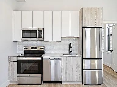 Brand new luxury living awaits in this sun drenched, modern apartment. Enjoy a stunning, renovated kitchen with clean white cabinetry, subway tile backsplash, and stainless steel appliances, including a full size refrigerator and dishwasher. The apartment features in unit washer and dryer, sleek light wood style flooring throughout, and recessed lighting, creating a bright and airy atmosphere. The bath boasts a contemporary vanity and a gorgeous tiled, walk in shower with a sliding glass door. Expansive windows flood the space with natural light and offer fantastic city and tennis court views. With high end finishes and a prime location, this apartment offers the best of urban convenience and modern style.