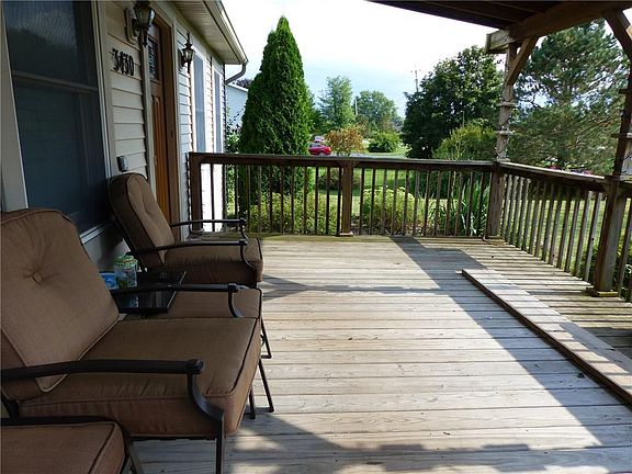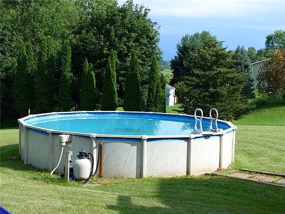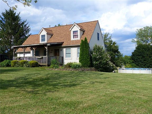 You are going to Love this home! (4) Generously sized bedrooms, combination Kitchen and dining area, Gas Fireplace in the Living Room, and a Full bath 1st floor with a 1/2 bath (with room for a shower) and (2) of the bedrooms on the second floor. There is a Full Dry basement, partially finished with a laundry area , utility area and a walkout to the back yard. Outside there is a mature landscape, large covered front porch,large rear deck overlooking the above ground Pool and view of the woods with over 13 acres total! Drive down the Black top drive to the attached (1) car garage w/opener and start enjoying this home Just minutes from Rt 104 & 21 . Easy commute to Rochester or South. Play sets excluded, all pool supplies will convey.