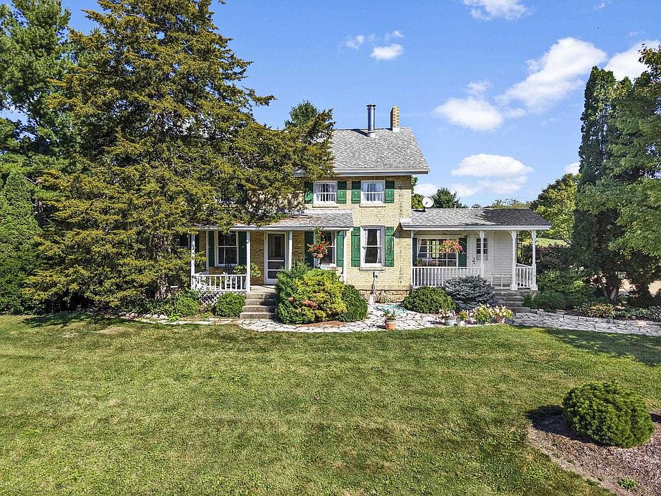 Storybook 1860s farmhouse located on a treed 5-acre lot, surrounded by peaceful views & timeless charm. The heart of the home is a warm, inviting eat-in kitchen with a built-in banquette & easy access to a welcoming front porch. A formal dining room w/a wood stove sets the stage for cozy gatherings, while the spacious LR offers a fireplace, a wall of bookshelves, & a door to a 2nd porch?perfect for summer evenings. Upstairs you?ll find 3 bedrooms & a beautifully updated bath w/a tub & shower, while the main floor offers a 4th bedroom (currently set up as a home office) along w/another full bath. Lovely 3-season porch w/its own wood stove overlooks the sweeping backyard, where perennial gardens & winding paths invite quiet strolls. Quaint pergola & 2-car detached garage w/attic storage.