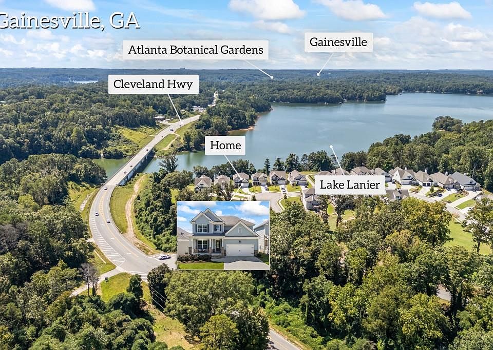 Lake Lanier Living with Deeded Boat Slip! Welcome to the Cottages of Lake Lanier, a charming, Gated community offering a picturesque lakeside lifestyle with a 2-story clubhouse with a living room, kitchen, bathroom, and several decks overlooking the lake. Also enjoy the outdoor firepit, walking trails, and a 6+ acre park. This beautiful "Windsor" floorplan showcases an open layout with a 2-story foyer and a formal dining room with French doors -- perfect as an office or flex space. Elegant coffered and tray ceilings elevate the design, while the chef's kitchen is equipped with a large island, quartz countertops, gas cooktop, 42" white cabinets, and wall-mounted microwave and oven. A laundry room on the main level includes cabinets and a utility sink for convenience. The stone wood-burning fireplace with cedar mantle is the centerpiece of the family room. The primary suite on the main level provides comfort and privacy, while the upstairs features an open loft, a second bedroom with private bath and walk-in closet, and two additional spacious bedrooms with a hall bath. Modern upgrades include smart home technology for security and efficiency. The unfinished basement offers endless opportunities for customization. Enjoy indoor-outdoor living with a screened porch and a newly installed open Deck with steps installed for easy access into the backyard. A new extended Patio and new fencing make it ideal for gatherings. Included is a deeded boat slip and pneumatic boat lift. Best of all, this home provides breathtaking lake and marina views. This is not just a house; it's a tranquil lifestyle on the lake.