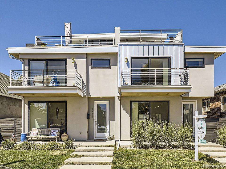 Beautiful LOHI Location! Step inside to enter main floor with open concept floor plan, that includes a dining room adjacent to the kitchen and living room space with high ceilings and a sleek fireplace. The spacious eat-in kitchen includes an oversized island with built-in range, ceiling mounted hood, fully equipped with Bosch appliances, a Samsung refrigerator, and adequate cabinet storage. Kitchen island has vast amount of countertop space and comfortably seats 4. Large windows on this main floor for plenty of natural light to create an inviting atmosphere. Home was built with custom, open steel stairs with wood treads. Upstairs there are 3 bedrooms conveniently located on the same level. Primary bedroom includes bathroom with beautiful tile throughout shower, double shower heads, dual vanity and large walk-in closet. 2 bedrooms with large windows share a Jack and Jill bathroom. Hallway laundry area with washer and dryer complete this floor. At the pinnacle of the home is a top floor that can be used as a home office or flex space of your choice, that leads to a private rooftop patio divided by a unique remote controlled garage door that can be lifted during nice days for an in/out feel. Enjoy scenic views of the Mile High City and entertain anytime of the year from this gorgeous rooftop.Finished basement has concrete flooring throughout and includes a bedroom, full bathroom which includes shower, tub and sink. Can be used as another flex space of your choice.