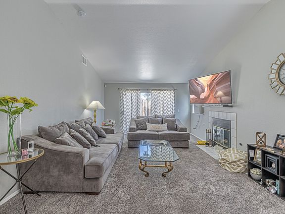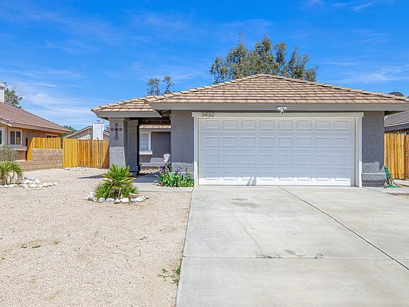 A delightful desert home in the secluded city of Rosamond! With a zero-scape front framing the driveway & walkway, enter an airy home highlighted by the tall ceiling of the living room with adjoining dining room that's enhanced by a cozy fireplace plus a mix of grey tone laminate floors & plush carpeting throughout. The kitchen includes tile countertops, ample built-in cabinetry, & a cute breakfast nook with backyard access. Adjacent to the kitchen is a convenient laundry room providing direct entry to the 2-car garage. The hallway has built-in storage cubbies while leading to spacious bedrooms complete with built-in closets & slopped high ceilings. The primary bedroom enjoys an attached bathroom offering a dual sink vanity. Outside, the backyard has ample patio space & lovely shade trees to create a charming space during any outdoor gathering. Set away from the bustling city but still a short distance away from nearby markets, shopping, restaurants, 14 Freeway, Edwards AFB, & more!