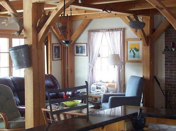 Custom, contemporary, barn style home. Timber frame construction. Stunning location, very near Burke Mtn. 12.92 acres+/- of open pasture and wooded land with westerly, long range views and a pond. Four stall "A+B" horse barn with water and electricity. Ample hay storage. Kitchen features maple cabinetry, granite countertops and Viking cooktop and oven. Finished walkout basement with family room, utility room and 3/4 bath all with radiant heat.