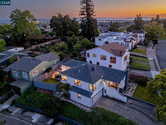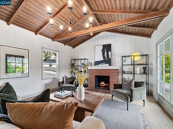 Maxwell Park Marvel! Artfully renovated from top to bottom, this modern re-imagination pays homage to its Vintage 1930s roots. Gorgeous cathedral wood beam ceilings, classic brick fireplace, wainscot paneling, art deco curved corner details, stained glass circle windows, and hardwood floors. Perched on an elevated corner parcel, this property benefits from extra sunlight and views of Oakland Hills and the sky. Blessed with a long driveway and large garage guarantees plenty of parking. The peaceful yard consists of a flat green lawn and 2nd tier lounge area. The Main house is on a single level (3bd + 2ba) and the bottom floor boasts a bright bonus flex room with a half bath and separate entrance, perfect for a gym, office, or guest room. Elevated and Tasteful living in a beautiful Maxwell Park!