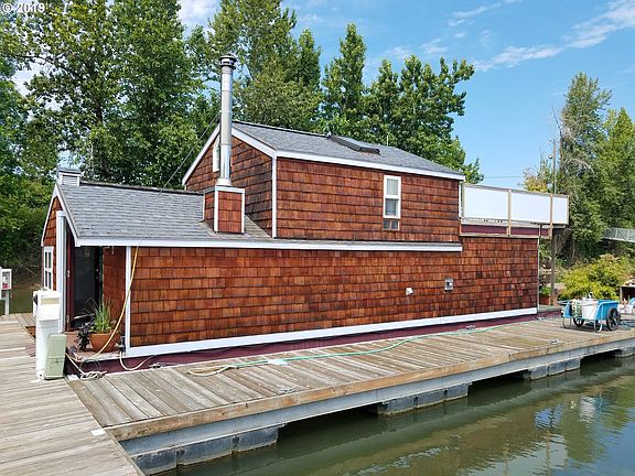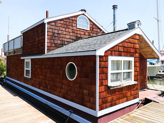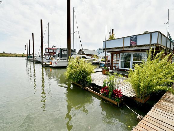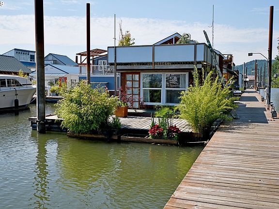 Craftsman built, floating home w/boat dock, built like a boat, inspired by tiny house. Enjoy the spacial efficiency of a boat with the comfort & style of a waterfront cabin. Surrounded by nature, in a quiet year-round community near Portland. Unattached garden deck float. Flat-bottom, barge-style, 40'x14' building, top deck with view of Mt. Hood and St. Helens. Hardwood, tile, and marmoleum floors.