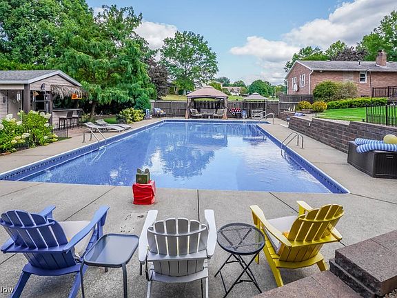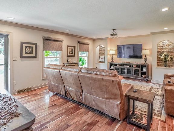 Dreaming of a home with space, style, and an incredible backyard? This updated all brick ranch in Greentree offers all that and more, including North Canton schools. Inside, the open layout connects a light filled living room complete with hardwood flooring and lighted display niches to a stunning eat-in kitchen with custom cabinetry, stone counters, stainless steel appliances, and a farmhouse sink. Enjoy meals at the breakfast bar or in the dining area by the fireplace.