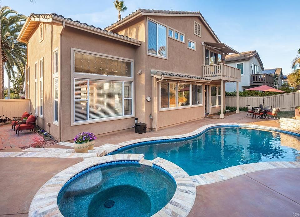 Lovely 4 bedroom + office, with 3 full baths, and a beautiful pool and spa in the neighborhood of Santa Fe Trails in La Costa. The high ceilings and lots of natural light welcomes you into the formal living and dining room, with tall windows and views of the pool. Enjoy the great open concept floor plan with a large kitchen, nook, and family room with a fireplace. Breakfast bar seating overlooks the spacious backyard with a beautiful pool and spa, and multiple seating areas to host and lounge. The first floor is complete with a large home office that can be converted to a first-floor bedroom, as well as a full bath, a large laundry room, and a finished 3-car garage. The second floor features a primary suite with a balcony overlooking the private backyard, and a large primary bath with dual vanities, a seated vanity, dual walk-in closets, and walk-in shower. Three additional bedrooms, and a full bath with dual sinks and a shower with a tub complete the second floor. The neighborhood features multiple grassy parks, one of which is located across the street. Close to shops, restaurants, entertainment, parks, and centrally located between a trifecta of top schools: Olivenhain Pioneer Elementary, Diegueno Middle School, and La Costa Canyon High School.