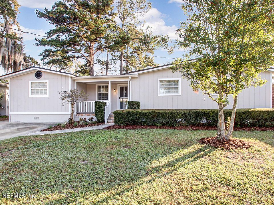 Freshly and tastefully renovated midcentury home int he heart of the Arlington Hills neighborhood. This home features a large lot, a spacious floorplan, contemporary kitchen, bathrooms, and a large and private sunroom in the rear. There are four very nice sized bedrooms here, along with a 5th room that would be great as a home office. Only 6 minutes away from downtown Jacksonville over the Matthews Bridge, as well as the stadium, baseball field, and the many concerts at the Vystar Memorial Veterans Arena. Finally, there is a approximately 160 sq ft detached outbuilding out back that is air conditioned - which can be used as a workshop, fitness space, or another office. Seller offering $2500 towards washer/dryer package, 2/1 rate buydown and free appraisal with preferred lender.
