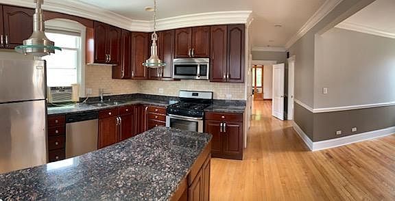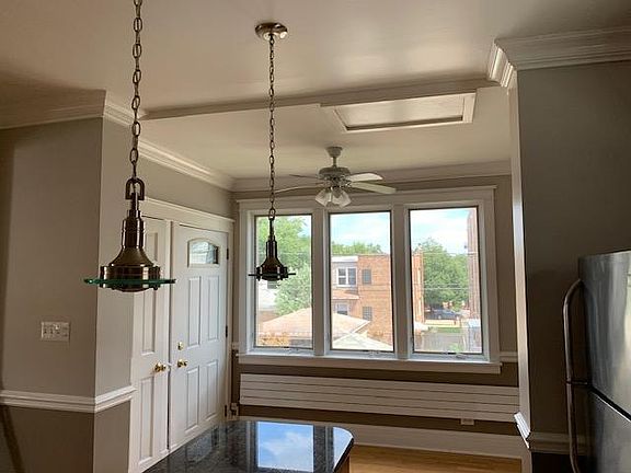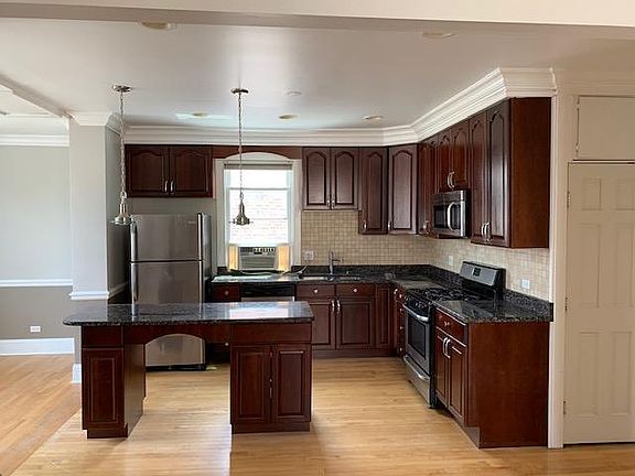 Classic and spacious 2 bedroom apartment in Avondale. Second floor unit. 1 bathroom with new sink, fixtures, and tile. Fresh paint. Brand new stove. Eat-in kitchen with space for office. Washer and dryer in unit. 1 garage spot included. Use of fenced-in backyard and garden. 5 minute walk to blue line Owner pays water, renter pays gas and electric. Covered garage spot included. Small pets allowed. No smoking.