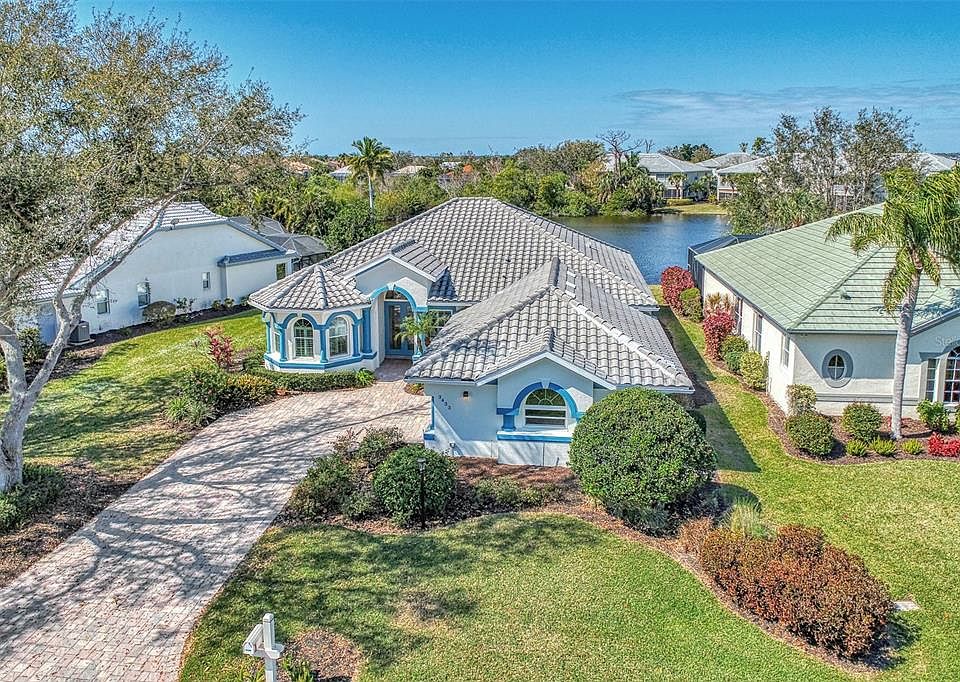 It's all about curb appeal and the breathtaking water views from this MOVE IN READY FULLY TURN KEY well-appointed property. Situated on a larger lot adorned with beautiful mature landscaping, this home exudes charm from the moment you arrive. The side entry garage, complemented by a paver driveway, sets the stage for elegance, while the tiled entrance and high-volume ceilings create a sense of spaciousness throughout. Step inside to discover a host of desirable features, including an extended lanai with tiled flooring and accordion storm shutters, perfect for enjoying the serene surroundings in any weather. The versatile layout offers a study or optional third bedroom, complete with three bay windows, built-in shelving, and a closet, providing flexibility to suit your needs. The Primary Bedroom is a tranquil retreat, boasting a slider to the lanai and a generously sized walk-in closet. The kitchen is a culinary delight, with quality cabinets and solid surface counters, while the guest room offers a walk-in closet for added convenience. The guest bath features double sinks, and the laundry room is equipped with cabinets and a tub for added functionality. The side entry oversized garage is a practical addition, featuring pull-down stairs and ample storage space. Bonuses include impact windows and storm shutters for peace of mind plus other recent updates, including an exterior painting in 2024, a new water heater and microwave in 2023, and a new dishwasher in 2022. The roof and air conditioner were replaced in 2016, ensuring years of worry-free living. Enjoy stunning lake views with an estimated 35' waterfrontage, adding to the allure of this remarkable property. Call to schedule a showing and begin to experience the charm this unique Florida property and the entire community of Riverwood has to offer. Riverwood, a gated, golf-centric, resort-style community, beckons you to embrace the Florida lifestyle fully. Enjoy daily walks or bike rides along the lush, tree-lined streets, engage in invigorating tennis or pickleball matches, take a refreshing dip in the resort style and lap pools, unwind in the hot tub, or participate in fitness classes at the Fitness Center. The Activity Center hosts a variety of programs and social events. Recognized as an Audubon Green Community award winner, Riverwood is celebrated for its natural habitat that supports Florida wildlife. Additional amenities include a lawn croquet, bocce courts, an art classroom, a library, and a dedicated dog park. Memberships for Riverwood Golf Club and the Riverwood Private Beach Club on Manasota Key are based on availability, and fees apply. Conveniently situated between Sarasota and Fort Myers on Florida’s West Coast, this home is just minutes away from dining, shopping, boating, cultural events, and the pristine beaches of Southwest Florida.