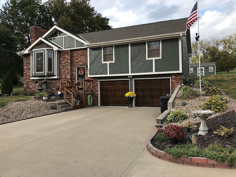 Interested parties can call or text 816.261.7915. Willing to work with buyer’s agents as well. This beautiful home sits on .5 acres and showcases an open floor plan with faulted ceilings throughout the living, kitchen, and dining areas. There are 3 bedrooms and 3 bathrooms with updates throughout. Kitchen features refinished glazed cabinets, granite countertops, tile floors, stacked stone backsplash, skylight, under/over cabinet lighting and updated appliances. All three bathrooms have updated vanities with granite or quarts tops and tile floors. The master bedroom is large with a raised tray ceiling and en-suite. The home boasts two wood burning fireplaces, one upstairs and one down and all lighting in the house has also been updated. The laundry room is downstairs and custom built for front loading units with storage for baskets underneath. The garage easily fits two large SUVs with plenty of room for storage as well. The exterior of the home has been freshly painted. There is landscaping wrapping around almost the entire house with tons of perennials for low maintenance enjoyment. The backyard features a large deck with sunshade, partially fenced in play area with rubber mulch of kids and a large patio. There is also a 10x20 lofted shed for more storage.