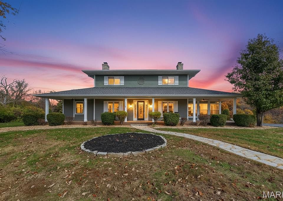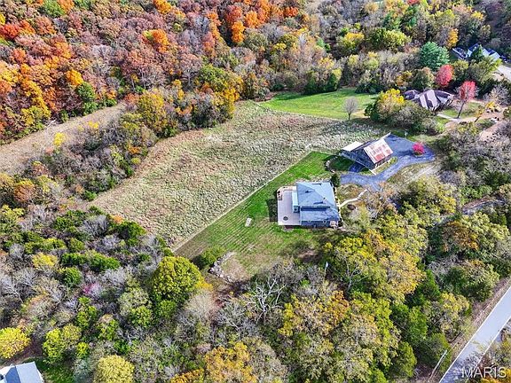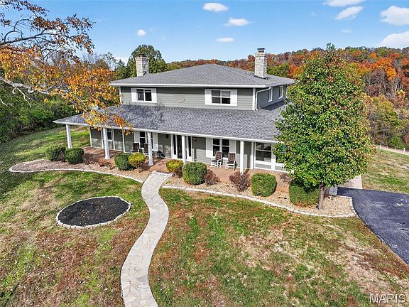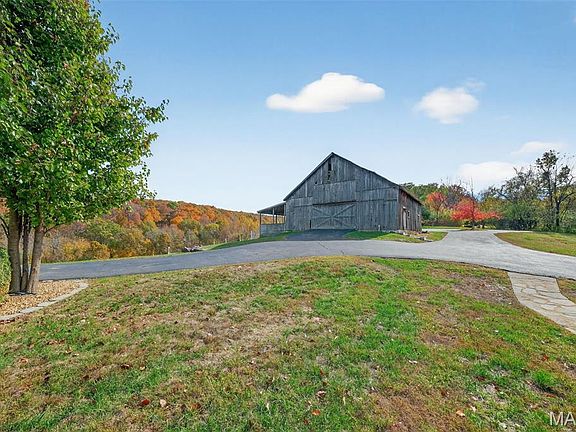 Nestled on 6 picturesque acres in Wildwood within the award winning Rockwood School District, this stunning 1.5 story luxury residence offers an exceptional blend of sophistication, craftsmanship, and comfort. Having graced the cover of St. Louis Homes & Lifestyles Magazine, this 3,664 sq. ft., 4-bedroom, 3.5-bath home is a rare retreat surrounded by mature trees and serene natural beauty. The main level welcomes you with professionally refinished wood flooring and elegant architectural details throughout. The inviting living room showcases a wood-burning fireplace with a custom mantle handcrafted by renowned St. Louis sculptor Bob Cassilly, complemented by crown molding and built-in bookshelves that create a warm, refined ambiance. The formal dining room also offers a wood burning fireplace with a secondary custom mantle and crown molding, providing a perfect setting for intimate dinners or festive gatherings. The gourmet kitchen is a culinary masterpiece with a vaulted ceiling, 42 inch double stacked white cabinets with crown molding, gleaming quartz countertops, a stylish tile backsplash, stainless steel appliances, and an expanded breakfast bar ideal for entertaining. A charming breakfast room with French doors opens to a breathtaking tree lined backyard, offering privacy and tranquility, while an adjoining sitting room provides an ideal space for relaxation. The main floor laundry includes cabinetry for added storage and an atrium door that leads to a spacious sunroom filled with natural light. The main level also features a beautifully appointed half bath with pedestal sink, crown, and chair molding. The luxurious main floor primary suite is a true retreat featuring a vaulted ceiling, ceiling fan with light, and French doors that open to a private concrete patio overlooking the wooded landscape. The en suite bath includes dual vanities, a soaking tub, and a separate step in shower, while an adjoining office adds convenience and versatility. A hand-carved newel post accentuates the staircase leading to the upper level, where a second en suite bedroom opens through an atrium door to a private deck, joined by two additional bedrooms with wood or luxury vinyl plank flooring, ceiling fans with lights, and a beautifully updated hall bath featuring ceramic tile, wainscoting, an upgraded vanity, and a shower-tub combination. Completing this exceptional property is a large barn with a concrete floor, fully equipped workshop, electric panel, spacious loft, and ample room for car parking, equipment, or additional storage. This extraordinary home offers refined country living with timeless elegance, comfort, and privacy in one of Wildwood’s most desirable settings.