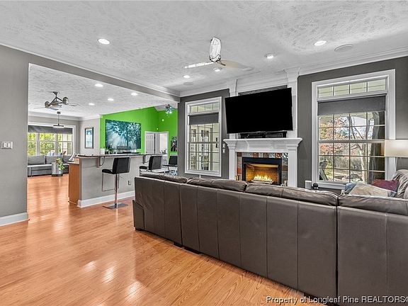 Custom home built by John Campbell in Jack Britt school district. True open floor plan that has amazing views from large windows spanning the rear of the home. Kitchen offers a wet bar, seating at two counter areas, hot water dispenser at sink, custom cabinets with soft close doors and drawers, granite counters, double ovens, 30 db dishwasher and a pantry. Interior features include 11' ceilings, tall crown molding, built-in amp & speakers, cultured marble bath counters with vessel sinks and custom shades. The shed is wired for electric. Storage closet and utility sink in the garage. Whole house (limited) receptacle for your generator. Trane HVAC 2018, tankless water system 2022. The basement has a vapor barrier, dehumidifier & sump pump. Back yard retreat will likely be a favorite spot with an amazing covered porch, extended patio area, salt water pool and a custom built-in fire pit w/attached grate & seating area. Wetlands at the rear property line so no home directly behind yours.