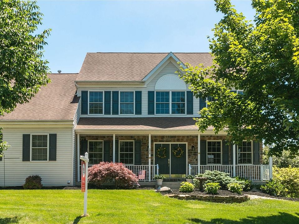 Every REX home comes with a 30-day buyback guarantee. Terms and conditions apply. Schedule your appointment with REX for a same day showing. Gorgeous 4 bedroom, 3 bath home with 2720 square feet in Center Valley! Stunning traditional style home with a large front porch and brick work on the beautiful façade. An elegant living room boasts soaring ceilings, a fireplace, plush carpeting and is light and bright with ample space for entertaining. The stunning custom kitchen is complete with beautiful wood cabinets, stainless steel appliances, a center island with counter seating, pendant lighting, smooth surface counters, a wine rack and garden window above the sink. A wood staircase leads to the bedrooms upstairs that are all generously sized with great closet space. The master offers a huge walk-in closet and a spa-like en suite bath with a garden tub, separate shower, dual sinks on a large vanity and lovely soft lighting. A park-like backyard has a huge deck that overlooks an expansive grass area and immaculate landscaping, perfect for enjoying the outdoors. Separate laundry room with a sink and tons of storage space. Such a special place to call home. Don't miss out. This will go very fast! Schedule a showing with REX today!