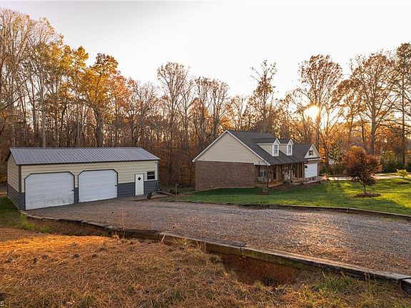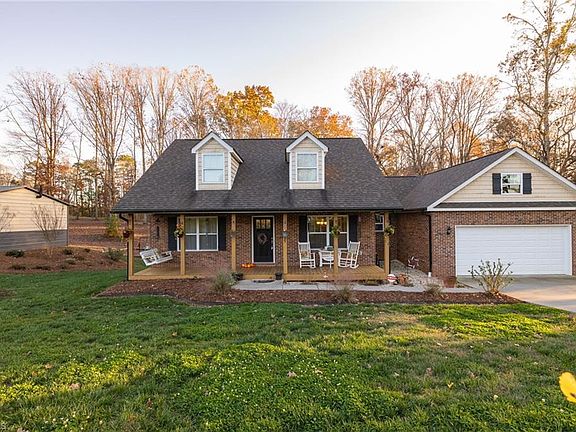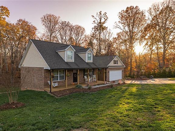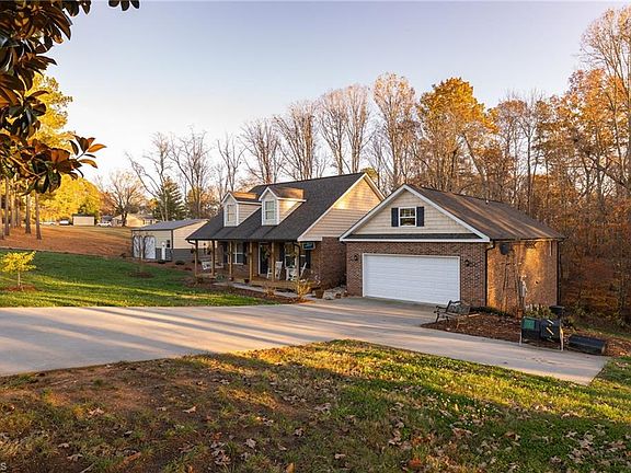 Wonderful opportunity in this 3 bedroom, 2 bath home in Pfafftown! Fabulous rocking chair front porch greets you as you walk up to the home. Engineered hardwoods flow throughout the dining and great room area. Kitchen features a great sized island, tons of cabinet space and pantry. Engineered hardwoods continue on to the bedrooms. Primary bathroom includes a double vanity, large shower and his & hers closets. Full unfinished basement with the potential to add extra square footage. The 24x35 detached garage is an added bonus with tons of additional storage, building is wired and includes a wood stove in the workshop. Come see for yourself and enjoy the country settings and no restrictions!