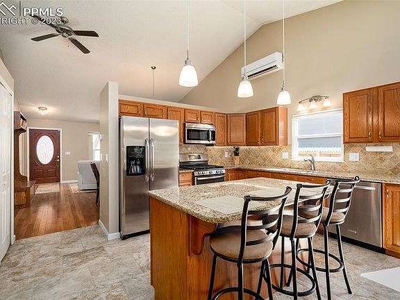 This fabulous immaculate Northwind Rancher is a must see! Conveniently located near the popular Cottonwood Creek Park. Enjoy the true main level living rancher with 5 spacious bedrooms, 3 baths and a bright and open main level floor plan. Spacious living room features hard wood flooring, vaulted ceilings that flows to the formal dining area. Enjoy the perfect remodeled kitchen that offers granite counter tops, tile backsplash, stainless steel appliances, a gas stove, nice sized pantry and eat up bar/ island, and a built in buffet bar perfect for enjoying coffee or for serving spirits while entertaining family and guests. Kitchen opens to the family room that is complete with a cozy wood burning fireplace and a walk out to the rear yard. The private backyard includes a storage shed, a wood shed with firewood that is included and plenty of mature trees, flowers and even a raspberry bush. There is a 25x12 concrete patio makes a perfect space for relaxing and enjoying summer BBQ's. There is another 15x10 concrete patio space for outdoor dining/entertainment and taking in the breathtaking Colorado sunsets. There are two bedrooms located on the main level, including the primary bedroom suite and convenient main level laundry. The private primary bedroom, includes an updated attached bath and a walk in closet. The 2nd oversized bedroom has a full guest bath just outside the room. The lower level has a large second living area, 3 more very spacious bedrooms and a updated full guest bath. Rounding out the lower level is a very cool "15 x11 Hidden Storage Space". The furnace was replaced in 2017 and water heater in 2020, nice finished oversized garage. Additionally, this home is located near schools, parks, amenities, dining and military installations. This gem is a beauty and a rare find. Ready to move in and enjoy the holidays!!