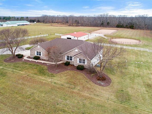 New Melle/Marthasville area Horse Property. Elegant great room ranch home on 5 acres with 5 stall barn. Fenced & cross fenced. Home features hardwood flooring; coffered & cathedral ceilings, see-thru fireplace; gourmet kitchen w/ granite counters, custom 42 in cabinetry & porcelain tile; master suite with updated vanity(also in hall bath), jetted tub, separate shower & double sinks; main floor laundry; oversized 2-car side entry garage; screened porch; deck; walkout LL w/ rough-in for full bath; patio & level rear yard. Horse facilities includes: 5-stall heated barn & wash rack, 12x12 stalls w/ French drains, hot/cold water, automatic waterers, tack room & hay storage; 60x120 regulation outdoor riding area; 60ft round ring; 36x60 well drained chat/dry lot off barn; front & side pastures with electronic fencing. The current owners added turn-out area and constructed all horse care improvements sparing no expanse to create this outstanding horse care facility. HSA Home Protection Plan.