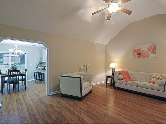 TOTAL Laminate flooring is new in the great room, kitchen, dining area, hallway and three bedrooms.Vaulted ceiling in the great room.Kitchen with breakfast bar, dishwasher, stove, microwave and a brand new side by side refrigerator w/ ice & water in door.Two beautiful bathroom vanities that look like furniture w/granite tops. New paint, nice front porch, rear patio, storage building and garage.