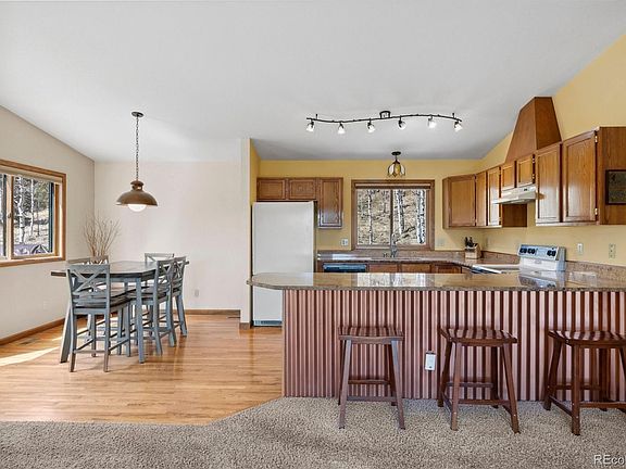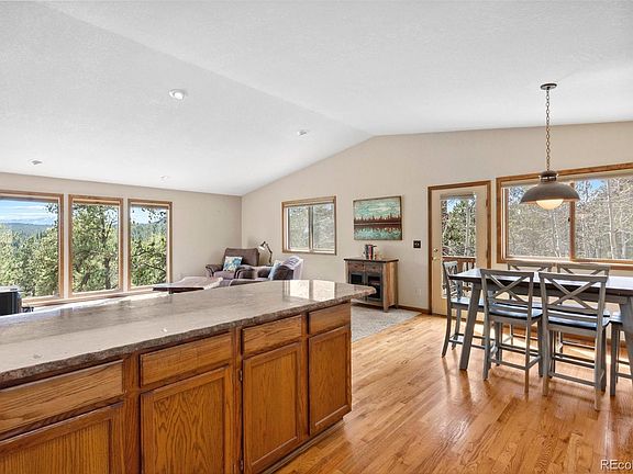 Elk Falls in Pine, Colorado is a Mountain Paradise surrounded by Staunton State Park. This beautiful cedar sided home is more than a place to live but a lifestyle unlike any other. It's like living at summer camp but w/all the amenities and conveniences of suburbia. Imagine starlit evenings on your deck, enveloped by the aspen grove where deer, elk and an occasional moose wander through the yard! Wake up to breathtaking mountain views that become a constant source of inspiration. Be regular at Staunton, just steps away. Hike through breathtaking landscapes, cast a line in the crisp cold waters of Davis ponds, or reconnect with nature on the miles of trails. Enjoy quick access to top-rated schools, restaurants, and the beautiful Conifer Safeway Center, all within a short drive. Hit the ski slopes at Breckenridge in 1.5 hours, avoiding the crowds of I-70. DIA, appx 1 hour and 4 minutes and downtown Denver 49 minutes. The kitchen has live edge granite slab countertops, undermount sink, a charming eat-in nook, this kitchen fosters connection and creativity & the corrugated copper colored accent wall is a nice focal point under the seating area. Outside the deck overlooks the aspen grove, perfect for grilling under the open sky. Retreat to a vaulted main floor primary suite w/luxurious remodeled ensuite bath a sumptuous stand alone jetted spa tub, granite countertops, spacious double vanity, a seamless glass pebble-floored shower, a spa-like experience in the comfort of your own home plus a huge walk-in closet. Step onto your private deck & breathe in the fresh mountain air, w/ stunning vistas as your daily companion. Imagine cozy nights spent gathered around crackling fires, creating cherished memories with loved ones. Downstairs a newer remodeled bath includes a steam shower! Imagine the adventures that await, the memories you'll create, and the sense of peace that will wash over you every day. Schedule a showing today and start living the Colorado dream in Pine!