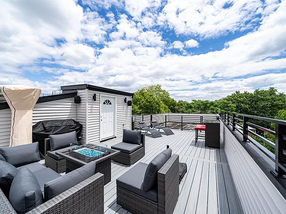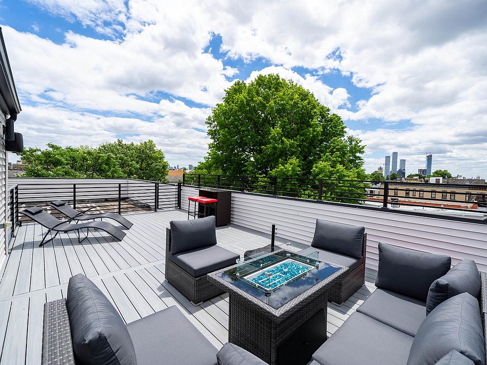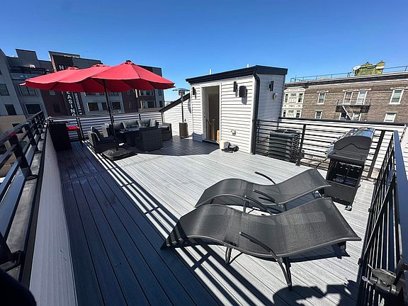 Welcome to your own private rooftop oasis in the heart of Jersey City Heights! This spacious 2-floor duplex home spans 1800 square feet and boasts a sleek, modern design throughout. The main level features an expansive open floor plan with a large living and dining area seamlessly integrated with a chef's dream kitchen. This kitchen is equipped with vented gas cooking, a built-in microwave drawer, a wine refrigerator, a convenient pot filler, a stainless steel farm sink, waterfall quartz countertops, and a generously sized center island with an overhang for bar stools. The living space is enhanced by a striking electric fireplace, oversized windows flooding the area with natural light, surround sound system, and contemporary lighting fixtures. A half bath completes this level. On the second floor you'll find three bedrooms and three full bathrooms. Two of the bedrooms are en-suite, each featuring a walk-in closets. The main bedroom also includes a private balcony, providing a perfect retreat. Additional features of this home include Select & Better white oak floors, 9-foot ceilings, solid wood doors, several storage closets, LED mirror lighting and glass enclosed showers in the bathrooms, Samsung washer/dryer, and recessed as well as custom lighting fixtures throughout. Conveniently located near major transportation routes including 1&9, the NJ Turnpike, Holland Tunnel, PATH trains, and the 125 bus to Port Authority, commuting from this location is effortless. Enjoy being just a few blocks away from Leonard Gordon Park and the Central Ave shopping district, offering ample recreational and shopping opportunities. Sorry no pets. Available for move-in starting Feb 15th, March 1st or flexible, this home promises a sophisticated urban lifestyle in one of Jersey City's most sought-after neighborhoods. Can be rented furnished or unfurnished for same price!!