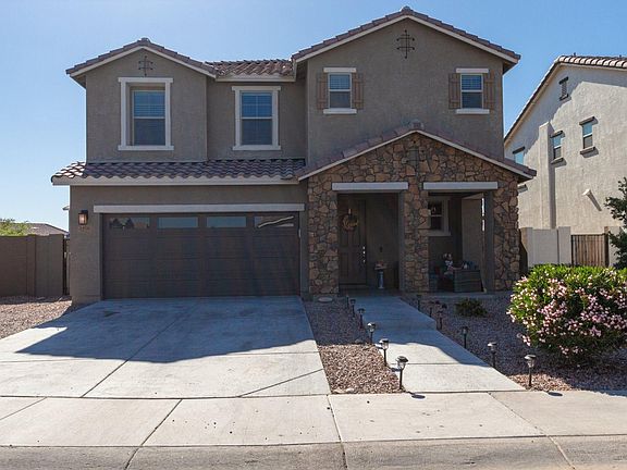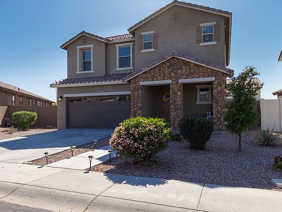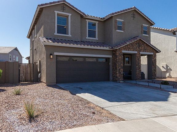 LOOK FOR 3D TOUR UPLOAD! Great curb appeal with the partial stone elevation and an inviting front porch. Enter to beautiful tiled floors and a spacious open floor plan that is perfect for gathering with friends & family! The eat-in kitchen has an abundance of extended cabinets,granite counters, island w/breakfast bar, SS appliances, upgraded lighting and pantry cabinets. Powder room downstairs perfect for guests. Laundry room is conveniently located upstairs. Large master has sitting area, bath that includes high double vanity, extended step-in tile & glass shower and private toilet room.. The backyard has a long covered patio with misting system, grass area and sand pit for playing games with your guests! Large enough for future pool! Community offers parks and lighted biking paths!