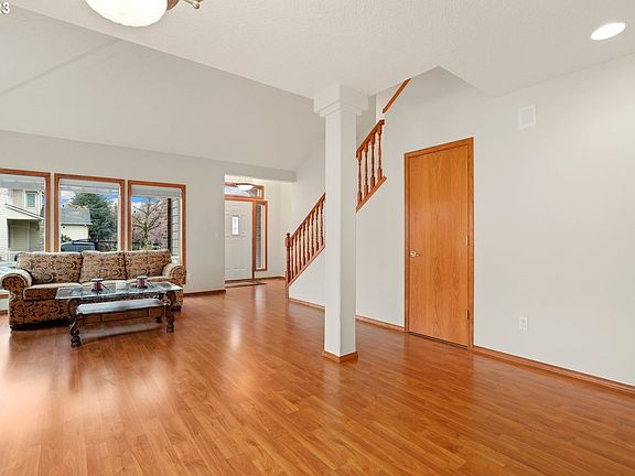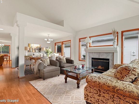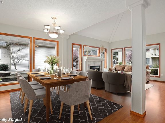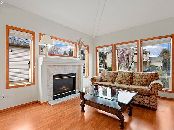 Open and bright floorplan - so many windows, and fresh paint throughout! Formal living/dining room up front, with cozy gas fireplace. Informal living/dining area in back, open to the kitchen. Spacious kitchen with gas cooktop island, new quartz countertops, SS appliances, pantry, and skylights. Large primary suite on the main level with access to the backyard; primary bathroom w/large tub and walk-in closet. Three bedrooms upstairs w/full bathroom. Covered patio allows for outdoor activities all year long, and garden boxes are ready for your gardening! Brand new fence in back allows for privacy. Two-car attached garage with a 3rd bay that can be used as flex space - home gym, art studio, office, extended pantry, etc. [Home Energy Score = 5. HES Report at https://rpt.greenbuildingregistry.com/hes/OR10203461]