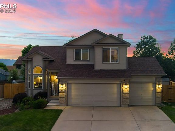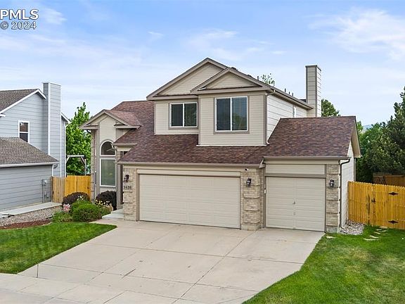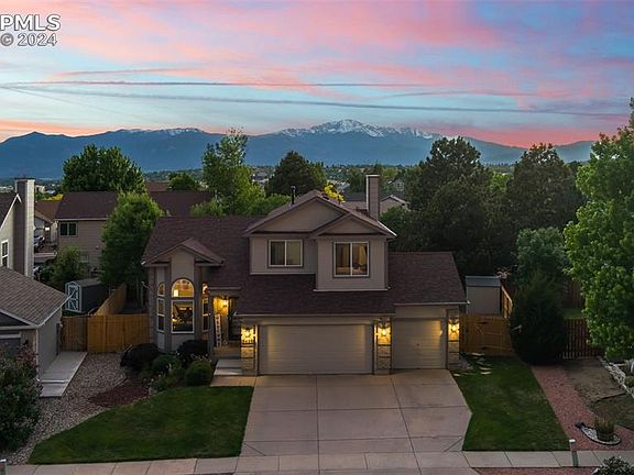 Welcome to your new home in Springs Ranch! This immaculate two-story beauty showcases a timeless floorplan, ideal for comfortable living and entertaining. As you step inside, you're immediately greeted by a generously sized living space adorned with beautiful LVP flooring, creating an inviting atmosphere throughout the main level. The spacious kitchen features newer stainless-steel appliances, low-maintenance Formica counters, and ample cabinetry. Across from the kitchen is a family room which works wonderfully as a secondary main level living space, complete with a gas fireplace. Also featured on the main level is a half bath/laundry room combo. Between the kitchen and family room is the dining space, which offers access to the backyard oasis through the back door. Step outside to discover a spacious backyard retreat, complete with a newer wooden deck featuring an attached pergola. The backyard also showcases a newer fence, mature trees offering shade and some privacy, and a convenient storage shed for all your outdoor essentials. Upstairs, you'll find two secondary bedrooms, a full bathroom, and a luxurious master suite. The master bedroom boasts views of Pikes Peak, while the ensuite bathroom has been recently remodeled to include a sleek shower with privacy glass and bench, and a double vanity with solid surface counters. The fully finished basement adds even more living space to this already impressive home, featuring a massive living room, a convenient wet bar for entertaining, a large fourth bedroom, and a private bathroom. Parking/storage is a breeze with the attached 3-car garage. Other notable features of this home include newer carpet, new flooring in the upper-level bathroom, a smart thermostat for energy efficiency, a new water heater, central air, and a new fence with a side gate which opens to allow parking for trailers or RVs. Don't miss your chance to see this gem!