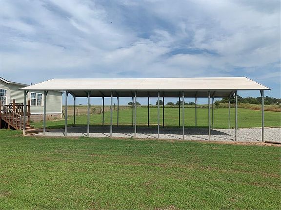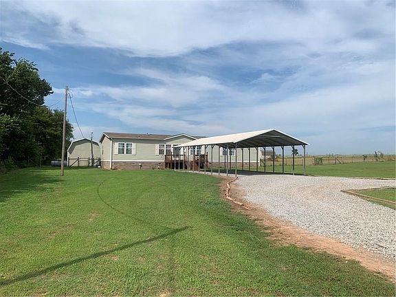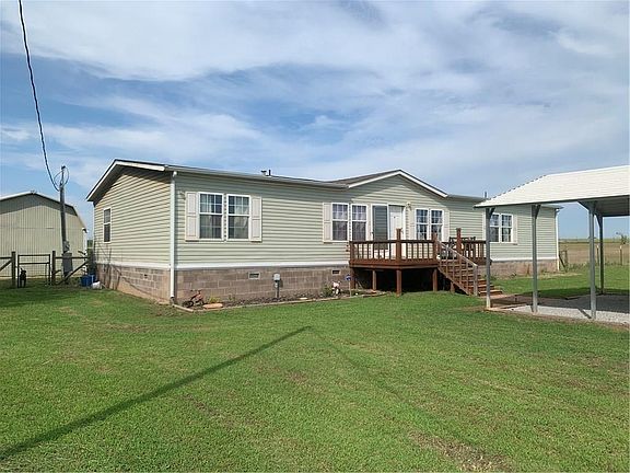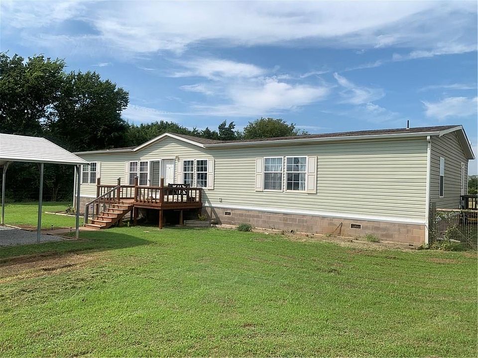 Super nice spacious double wide with block skirting in great condition set up on a permanent foundation to qualify for VA/FHA financing. Enjoy the country life with a great view and privacy but still less than a mile off pavement and town. All bedrooms are good size with good size closets. Nice open concept with large kitchen and dining room which flows nicely into the living room. New HVAC system installed in July 2019, new aerobic septic system installed in 2015. NEW granite counters in bathrooms. Large fenced in back yard features chicken coop, in ground storm shelter, nice wooden approx. 10 X 12 storage building and another larger outbuilding with separate office area with air conditioner and heater with attached dog kennel. Enjoy your morning coffee on your front deck with a nice view. Circle drive with 4 car carport. In addition, seller is leaving refrigerator, washer/dryer and a 2016 John Deere Z335M Z Trak zero turn radius mower!