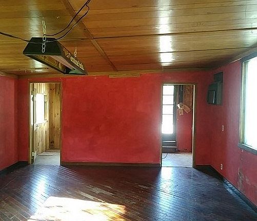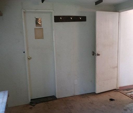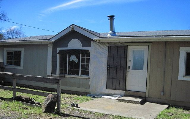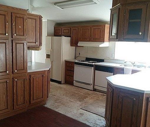 This manufactured home residence consists of three bedrooms and two baths, open kitchen, bathroom missing toilet, living room with fireplace, dining room, side deck. Property is in need of TLC.