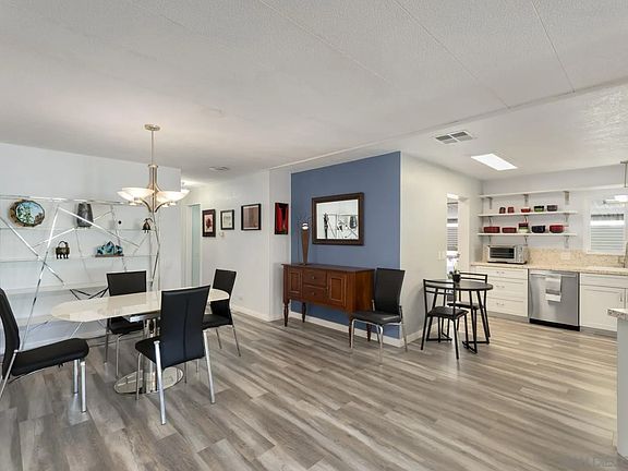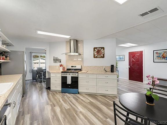 A Must See! This centrally located 55+ land owned 2 bed/2 bath/1560 ESF manufactured home features the following upgrades: Remodeled kitchen including counters, cabinets with self closing drawers, Dishwasher, & Refrigerator …Additional updates include Milgard dual-pane windows and French doors…water heater….Earthquake bracing for foundation….Fresh interior paint…commercial size washer/dryer…drip irrigation. Other noteable features include a large storage + a shed as well as a generous sized California room. Rancho Carlsbad is a gated 100+ acre community of active seniors surrounded by nature. Residents can enjoy a variety of amenities such as a pool/spa, fitness center, activity rooms, men's and women's massage rooms, and the Ping-Pong Palace. Just beyond the lagoon bridge lies the Clubhouse, hosting a large ballroom, a lounge with a big screen TV for movie or game nights, a pool room with multiple tables, and a card room, along with a fully equipped catering kitchen. With over 35 clubs catering to diverse interests like arts and crafts, guitar, pickleball, tennis, "yappie hour" in the dog park, yoga, and more, residents have ample opportunities for social engagement. The community also offers a spacious garden site for maintaining personal garden plots and an RV parking facility. Golf enthusiasts can conveniently access the 18-hole Rancho Carlsbad Golf Course located within the community.