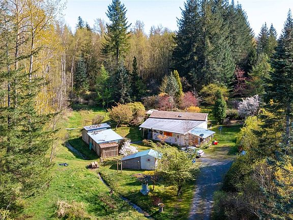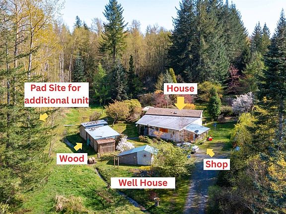 Beautiful parked-out secluded 4.7 acre property on a quiet country road. Older mobile home is livable but needs a new roof. There is a separate entrance and driveway to second building site that has a 30'x40' concrete pad, a separate 2 bedroom septic system, a shared water source and power to the site. There was a mobile home there that has been removed. Property is level and mostly covered with mature trees. The entire property has been mowed in the past. There is an attached shop/garage to the main house for hobbies, storage, entertainment or whatever you want to use it for. Both septic systems inspected satisfactory on 04-03-25. Several outbuilding make it look like an old Western town. Live there as it is or build a new home.