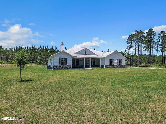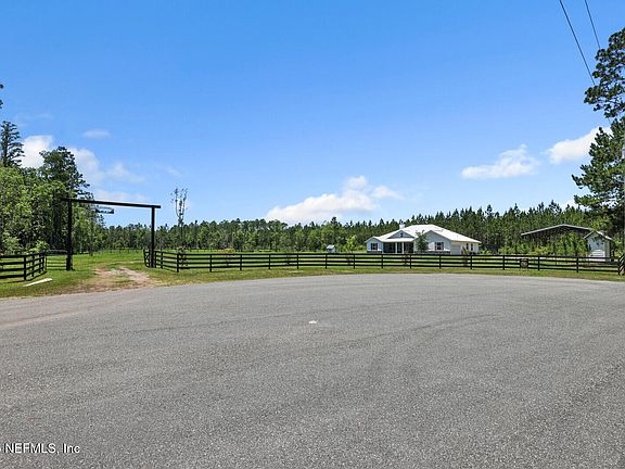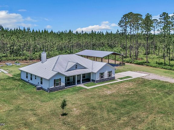 This 2019-built home is situated in the equestrian community of Tupelo Plantation. The property encompasses 9.34 acres and features a fenced grazing area suitable for pigs, horses, and cows, a chicken coop, and a spacious 50'x48' aluminum open-air pole barn with a concrete slab, electric hookup, and water supply. Inside, you'll find custom shiplap accent walls, wood built-in cabinets, and a stone fireplace. The home also boasts screened front and back porches with upgraded cabinetry, granite countertops, and a wrap-around island. In addition, there is an office or formal dining room, a 2-car garage, and a well pump house. The community lake house is equipped with a kitchen, bathroom, two fishing docks, and a beach area.