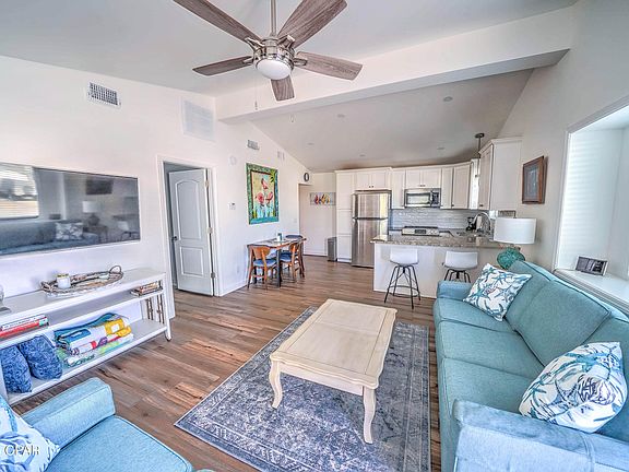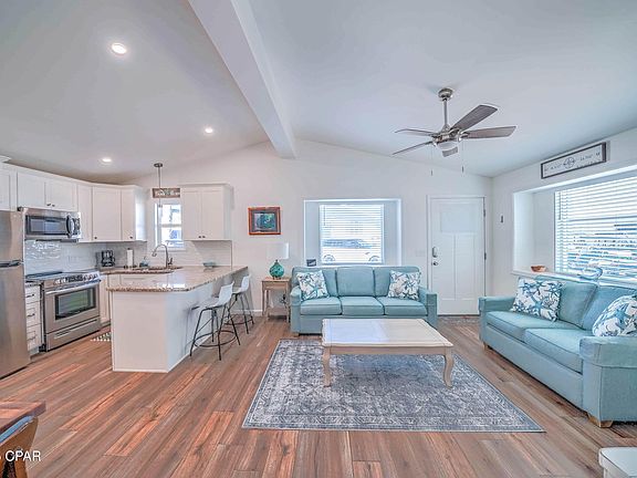 Here's your chance to discover the best of Venture Out! Check out this stunning 2 bedroom, 2 bath home that has been completely renovated from top to bottom. This pristine home has new Hardie siding, new windows, new doors and new luxury vinyl flooring. The gorgeous new kitchen has new appliances, beautiful granite, a tile backsplash and oversized sink. The open and airy designed living space adds to the charm of the home and leads you into each private living space with ease. Each of the large bedrooms offer ample storage space and nice finishes. The primary suite even offers a laundry suite with storage which makes doing laundry super convenient. Each bathroom has also been fully renovated offering a spa-like experience blending beachside charm and modern luxury. The home is located on a nice quiet street and the driveway offers plenty of room for 2 cars and a golf cart (a rare find within the resort)! The home is being sold fully furnished and ready for you! Perfect opportunity for investment or second home. Venture Out is a golf cart community that has exploded with popularity recently... With 300' on the beautiful pristine beaches of the Gulf of Mexico and 1,000' on the Grand Lagoon. Venture Out has something for everyone.