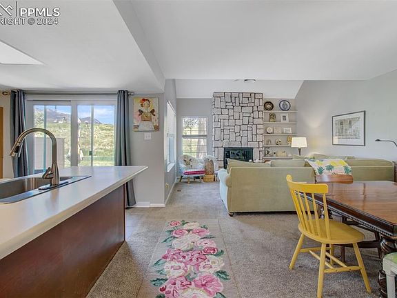 Welcome home to this charming & serene, 3 bedroom/3 bath end-unit townhome located in the beautifully maintained Cobblestone at Cheyenne Mountain Ranch. This townhome is positioned perfectly, backing up to The Country Club of Colorado at Cheyenne Mountain Resort Golf Course with great views of Cheyenne Mountain just outside your back door. As you walk in the front door, you will notice the vaulted ceilings and openness of the great room with floor to ceiling fireplace and windows to let the sunlight fill the room. The kitchen is open to the great room with new stove, refrigerator and microwave and a walkout to the amazing back patio with spectacular views of the mountains and "to die for" sunsets. The back patio is truly a tranquil haven to enjoy the breathtaking views or walk the pathway around the golf course & lake, right from your patio. The main level also includes a great sized bedroom & bathroom. Upstairs you will find a large loft area and primary suite sanctuary to include an updated bathroom with newer double sink vanity, luxurious shower and amazing views of the mountains and golf course. The primary bedroom has plenty of storage with a cedar lined, walk-in closet and "cubby" storage on either side of the quaint window seat. The perfect place for enjoying your morning coffee. In the basement you will find a large family room, great sized bedroom, bathroom and incredible storage & laundry area with floor to ceiling shelves. The beautiful landscaping and availability to so many walking paths with amazing views of the Country Club Lake, Golf Course and beautiful Cheyenne Mountain truly sets this community apart from the rest and is still close to Ft Carson, shopping centers, downtown Colorado Springs and more. Don't miss this one. Come and see it today!