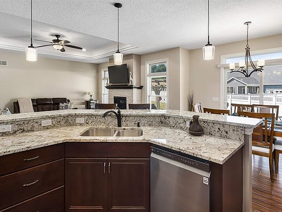This is just what you have been waiting for! 5 bedroom, 3 bathroom just like new construction Eldridge ranch! Open concept main living area with tray ceiling & gas fireplace in the great room. Nice size eat-in kitchen with ample cabinet space, large breakfast bar, granite countertops, appliances stay! Main level laundry. Attached, over sized 35x24 3 car heated garage! 3 large bedrooms on the main level. Master suite features walk in closet, lit tray ceiling, double vanity, & walk in tile shower! Recently finished basement (2021) has a large rec room with built in speakers, wet bar with granite counter tops, office space, and 2 additional bedrooms & 3rd full bathroom, plus plenty of storage space! This home has a large fully fenced yard with stamped concrete patio & pergola. North Scott Schools! This is a must see and wont last long!