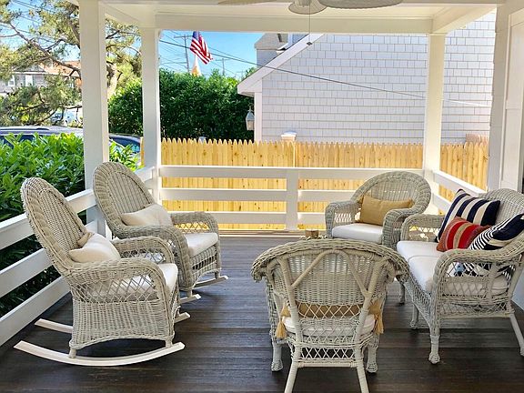 Summer Rental... Four homes from the ocean, front porch filled with wicker. A very private backyard with a brick patio for welcoming guests throughout the summer. Walking distance to shopping and restaurants. This classic Bay Header has a spacious living room, dining room, sunporch, custom kitchen with wet bar. This home features 5 bedrooms 3.5 bath. The availability is from Aug 16th - Labor Day. $7,000 per week, $250.00 cleaning fee, owner provides 6 beach badges. Sorry No Pets...