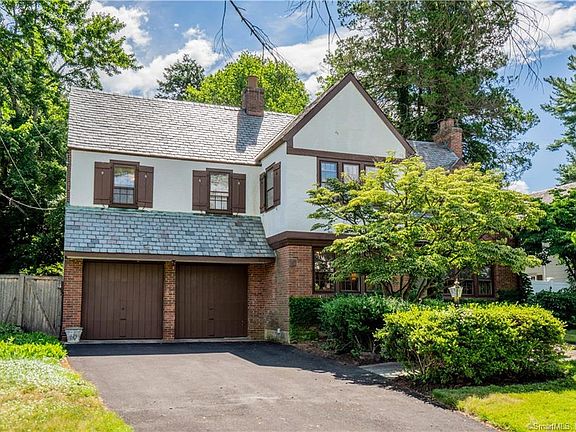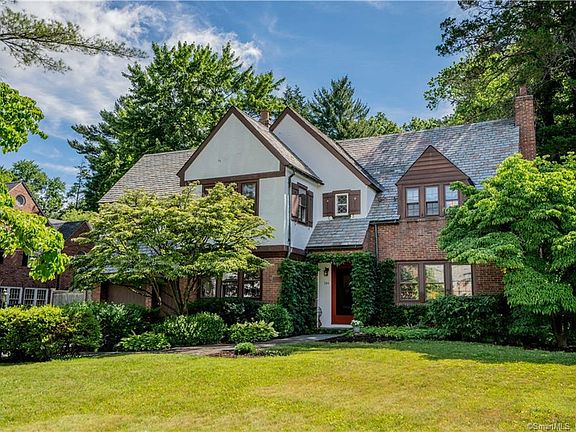 Gracious 1930's Tudor Revival featuring 5 bedrooms plus 3.1 baths located on a private 1/3 acre lot on a lovely street in the Hartford Golf Club Historic District. The 3459 square foot brick and stucco home has a slate roof, hardwood floors throughout, front & back staircases, gas heat and hot water plus central air and an attached 2 car garage. The tiled vestibule leads through French doors to an entry foyer. Bi-fold French doors open the way to the large front to back living room with a wood burning fireplace (with electric insert and access to the patio and yard. The lovely formal dining room also has double French doors leading to the stone patio and private yard. Great floor for entertaining or family gatherings. The spacious eat-in kitchen has a retro feel and offers lots of storage. Ther main floor also has a cozy library with built-ins. Upstairs you will find the 5 bedrooms and 3 full baths (all on the 2nd floor. The primary bedroom has 2 closets and a private en-suite. Several bedrooms have walk-in closets and one also has the 3rd full bath attached. There is a surprise in the 4th bedroom There is a jacuzzi tub in the corner. It was installed by the previous owner and not used by the current one. It would be a perfect spot for an upstairs laundry. For extra storage there is a walkup attic and a partially finished lower level.